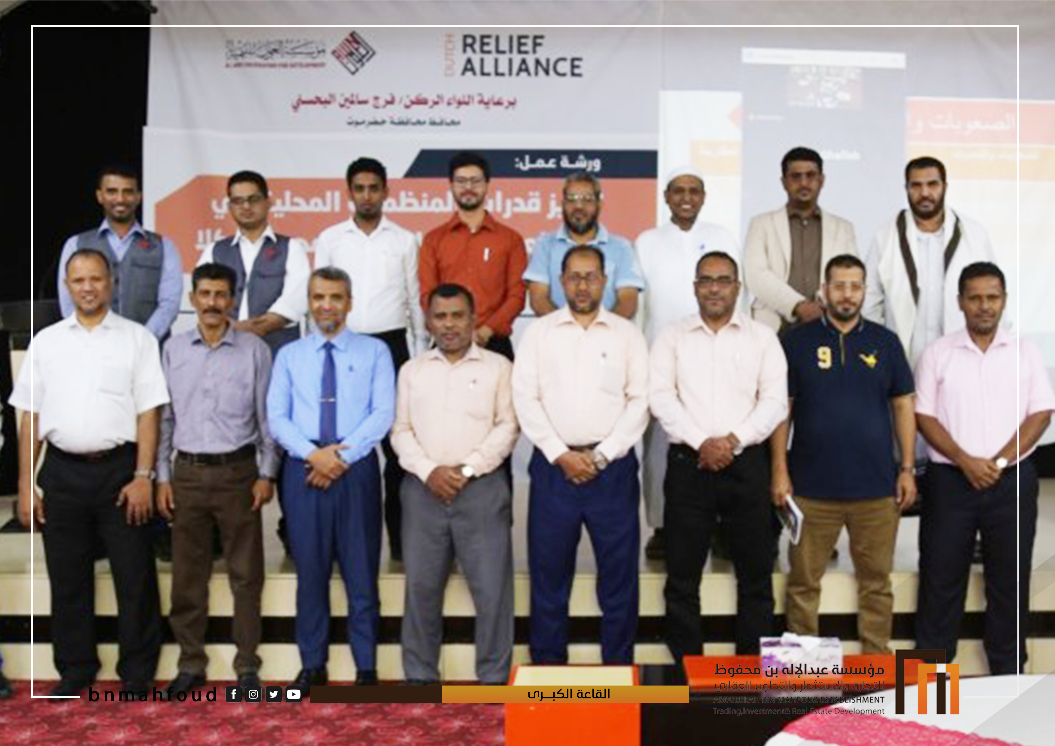 والتي تاتي برعاية مباركة من السلطة المحلية بالمحافظة ممثلة بسيادة اللواء الركن فرج سالمين البحسني محافظ حضرموت وبتمويل ائتلاف الإغاثة الهولندي (DRA) ومؤسسة العون للتنمية (AFD) . شارك في الورشة عدد 20 فرد من قيادات المنظمات المحلية في مجال العمل الإنساني بمحور المكلا ويقدمها الميسر أ. إبراهيم بن قفلة وتهدف إلى تحديد المجالات ذات الأولوية لتنمية القدرات وفقاً للمتطلبات لتخلق رؤية واسعة حول القدرة على تحقيق الأهداف المستقبلية. تم خلالها اكتشاف واستعراض مسببات نقاط الضعف التي تعيق تطوير القدرات، وعليه يتم صياغة استراتيجيات تنفيذية لبناء هذه القدرات على التزامات حقيقية تحدد اتجاهات هذه المنظمات وتحقق أهدافها المشتركة.